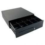 kassalade, opening voorzijde, 406x124x427mm, 4 biljet compartimenten, 8 munt compartimenten, verwijderbaar, 2 cheque compartimenten, cilinderslot, 4-pos. Slot, 12 V, 24V, RJ11, stroomvoorziening: zwart